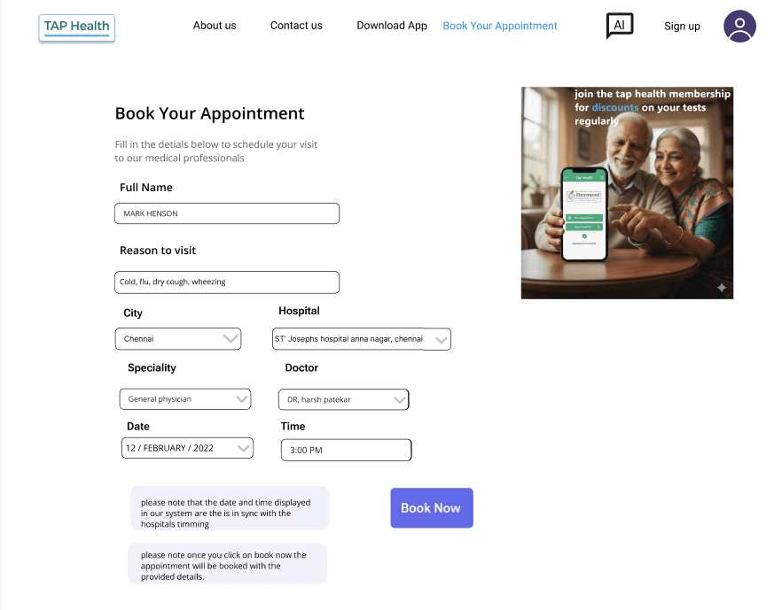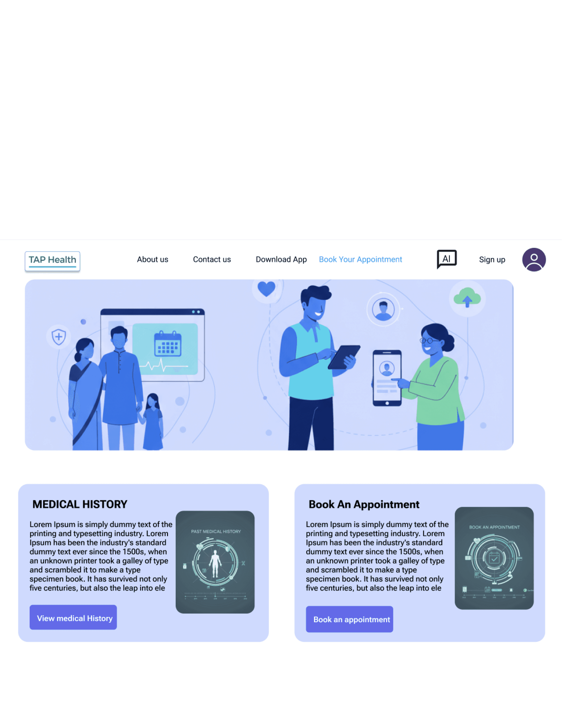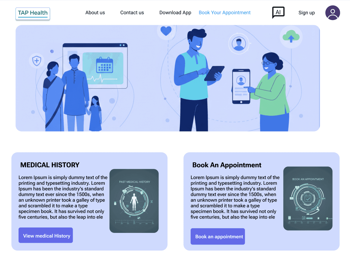 Tap Health is a modern healthcare website/app designed to simplify the way we manage our medical lives. It allows users to view and store their medical history, book doctor appointments, and schedule health tests — all in one seamless platform.